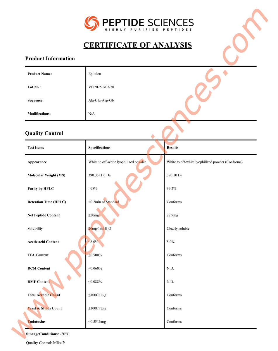 Epithalon is a synthetic tetrapeptide (Ala-Glu-Asp-Gly) supplied as a research material for controlled laboratory workflows. For experimental planning and materials qualification, laboratories commonly verify peptide identity and assess analytical attributes using characterization approaches appropriate for peptide materials, in alignment with internal method requirements and study protocols.