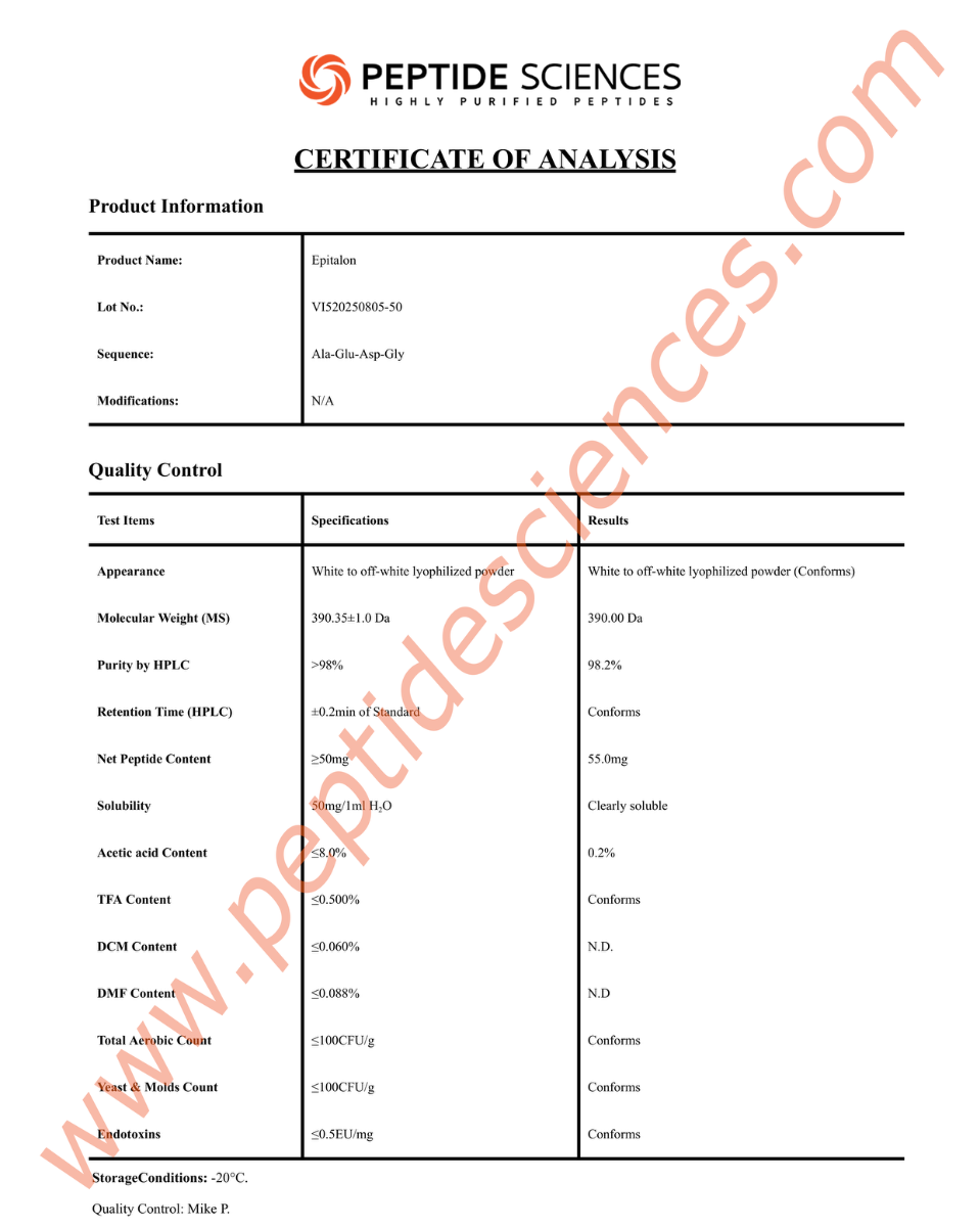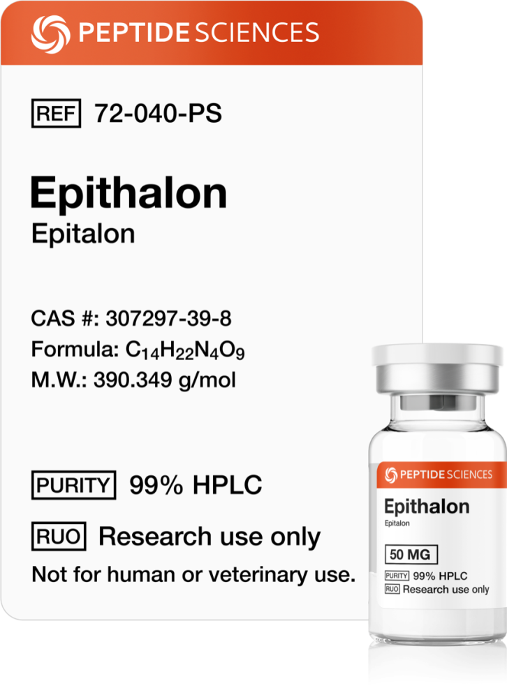 Epithalon (Epitalon) is a research peptide consisting of a synthetic tetrapeptide (Ala-Glu-Asp-Gly) derived from the natural thymic peptide Epithalamin. It has been shown in preclinical research to influence telomerase activation, oxidative regulation, and circadian gene expression via modulation of pineal peptide signaling pathways. Epithalon is utilized as a model compound in studies investigating genomic stability, epigenetic control, and neuroendocrine peptide regulation.